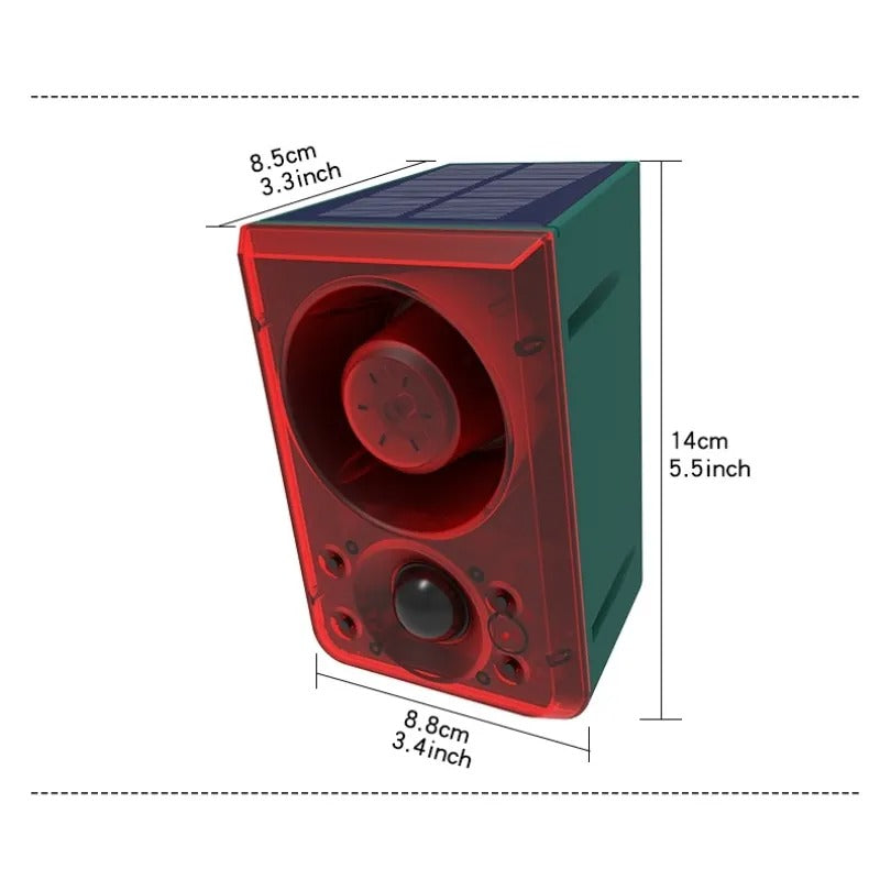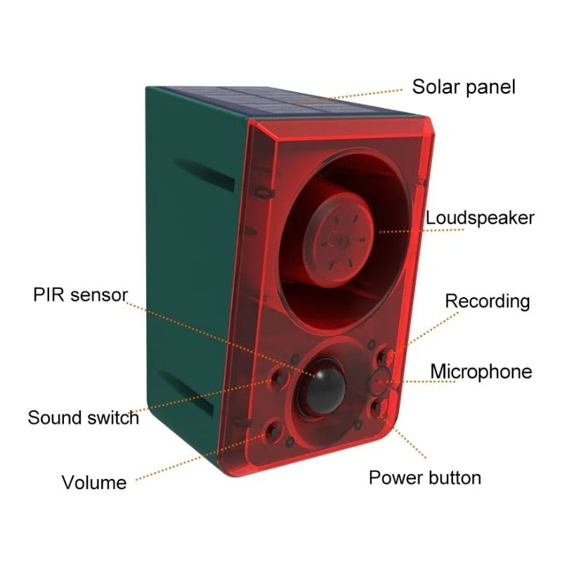 🚨 24/7 Smart Protection – Automatically detects motion both day and night, triggering loud sounds and flashing lights to scare off intruders or wild animals.
